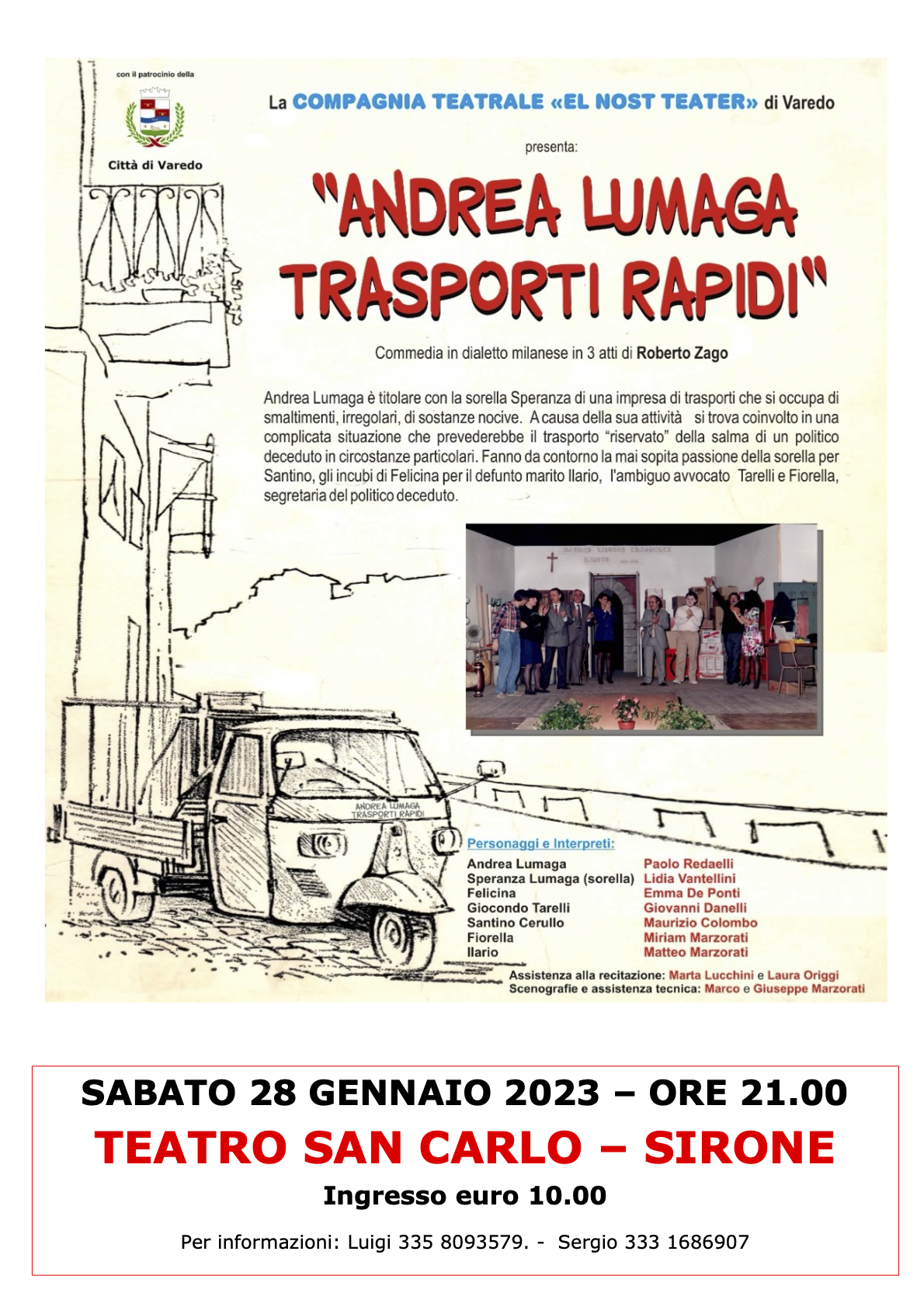La compagnia teatrale “El nost teater” di Varedo presenta “Andrea Lumaga trasporti rapidi”, commedia in dialetto milanese in tre atti di Roberto Zago.